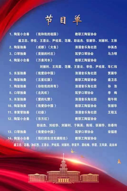 活动中,教职工陶笛协会表演了三管陶笛独奏《五星红旗》、三管陶笛独奏《我爱你中国》\单管陶笛合奏《东方红》、单管、三管陶笛合奏《万泉河水》、陶笛和口琴合奏《我们的生活充满阳光》。筑梦口琴协会表演了复音口琴独奏《美丽的村庄》、半音阶口琴独奏《北风吹》、半音阶口琴独奏《我爱你中国》,充分体现出参演者的艺术风采。