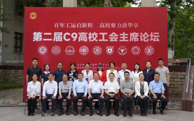 5 月 17 日,以“百年工运启新程,高校聚力谱华章”为主题的第二届 C9 高校工会主席论坛在中国科学技术大学举办。安徽省总工会党组成员、副主席胡少石,中国科学技术大学党委副书记、工会主席周丛照,安徽省教科文卫体工会主席、一级调研员吴海明出席论坛开幕式。来自北京大学、清华大学、复旦大学、上海交通大学、南京大学、浙江大学、中国科学技术大学、西安交通大学和我校的九所高校工会负责人及相关人员参加论坛。
