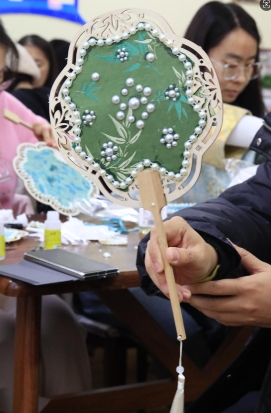 本次活动旨在帮助女教职工放松身心、陶冶情操,同时感受中华优秀传统文化的魅力。王一婷老师结合自身在手工艺创作方面的丰富经验,细致讲解了团扇制作的每一个步骤和操作技巧,并鼓励每一位参与者在珍珠点缀中融入个人巧思,通过亲手剪裁、细心粘贴,打造一把兼具美感与心意的专属团扇。
