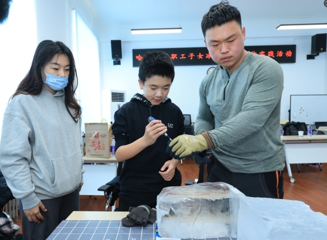 本次实践活动课程由哈师大冰雪创意设计实践中心专业团队全程指导,通过理论讲解、作品赏析与实践操作相结合的方式,主讲老师带领孩子们系统了解冰雪雕刻的历史演变、工具使用与创作技法。在温馨有序的课堂氛围中,孩子们不仅学习了冰雪艺术的创作理念,更在亲手雕刻的过程中感受冰雪材质的独特美感,完成了属于自己的冰雪小作品。活动现场,孩子们专注聆听讲解,积极动手尝试,从最初的构图设计到逐步成型,每一个环节都凝聚着他们的巧思与热情。指导老师耐心示范、细致辅导,确保每位学员在安全操作的前提下充分体验创作的乐趣。